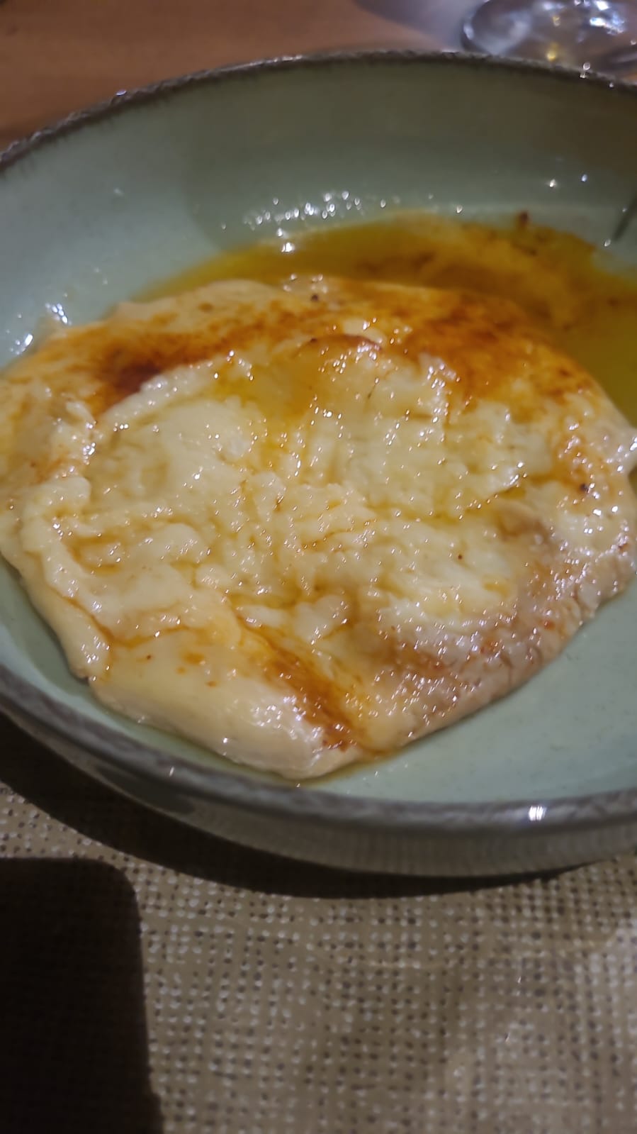 Entrante: torta del casar con un toque de pimentón que superó nuestras expectativas. Adicionalmente, canelón de rabo de toro, tan bueno como suena