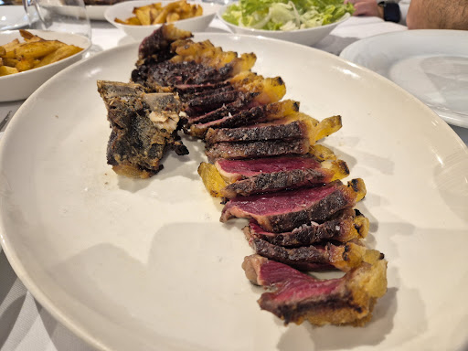 La chuleta, más de lo mismo: Casi 2.5Kg. Buen producto, sin duda, pero de nuevo muy por encima de lo necesario para un grupo que ya había comido y pretendía simplemente probar ambos platos. Hubo que hacer auténtico esfuerzo para terminarla. Algún postre y café para terminar.