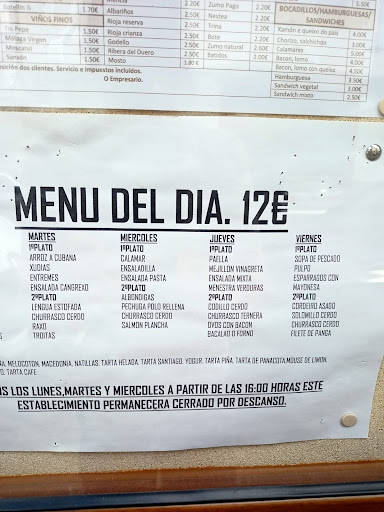 Read moreMi experiencia en este lugar ha sido terrible. Nos hicieron esperar bastante y el servicio dejaba mucho que desear. Nos han cobrado 9 euros por un menú peor que el de un COLEGIO. De primero nos dan a elegir entre sopa de pescado (en agosto?), entremeses(pensaba que eso era de los años 80), espárragos blancos con mayonesa y gambas rebozadas. Ante tan suculentos platos pedimos las gambas pensando que eran frescas. Sorpresa! Son gambas con gabardina congeladas marca blanca del mercadona. Grasosas y repugnantes. Pedimos unas navajas para compensar el error del primer plato, vienen 4 unidades llenas hasta arriba de arena, incomibles, y lo mejor...nos cobran 7 euros!!!, indignante. El segundo plato, dos brochetas de pollo y un filetito minúsculo de ternera. Pasable. Postre, tarta helada del mercadona y macedonia, pan y una botella de agua....total 25euros. Me siento estafada, pero además de verdad, lo que nos han puesto era comida de 6 euros. Pero ahí no queda la cosa, en el menú escrito fuera ponían platos que a nosotros ni nos nombraron. Sería porque no éramos del minipueblo?. Yo no recomiendo ir para nada, los restaurantes de Meira son mejores y más económicos. No...