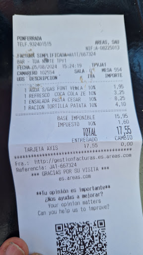 Read moreNo pongo menos estrellas porque no se puede. Me acaban de robar en toda mi cara y encima me dice después de insistir mas de una vez en que es lo que hay. Os pongo en situación: Cojo una ensalada, un plato de merluza con arroz blanco y una Cocacola … 25€, le digo que me parece excesivo y dejo la ensalada, me cobra por el resto 16,75€, Insisto en que me parece increíble debido a que la calidad de comida no es especialmente de lujo como para cobrar eso (parece catenring de hospital) y me contesta la chica que ella no pone los precios. De acuerdo, estoy trabajando y no me puedo permitir buscar más sitios para comer a esta hora. Pago, me lo como y salgo para irme. Veo un cartel que pone menú del día ¡transportista esto te interesa! …( yo soy transportista, no voy con traje ni nada que te haga pensar que no lo soy, por lo que me podías haber preguntado siendo un área de servicio pero bueno) paso y le pregunto y me comenta que claro el menú de transportista cuesta 15€ con primero, segundo y bebida. Genial! Me han robado en mi cara, me han cobrado por un solo plato, más precio del que era el menú, ya que según la empleada la ensalada no entraba como primero por eso los 25€ del principio 🙄… Total que encima la culpa es mía por no preguntar o no se pero solución ninguna, Lo suyo es que si una empresa ofrece ofertas de algún tipo y encima te reiteran el alto precio de producto ofrezcas o informes de las diferentes formas de comer en tu local. No lo recomiendo a nadie de hecho espero que ningún pobre transportista como yo tenga la mala suerte...