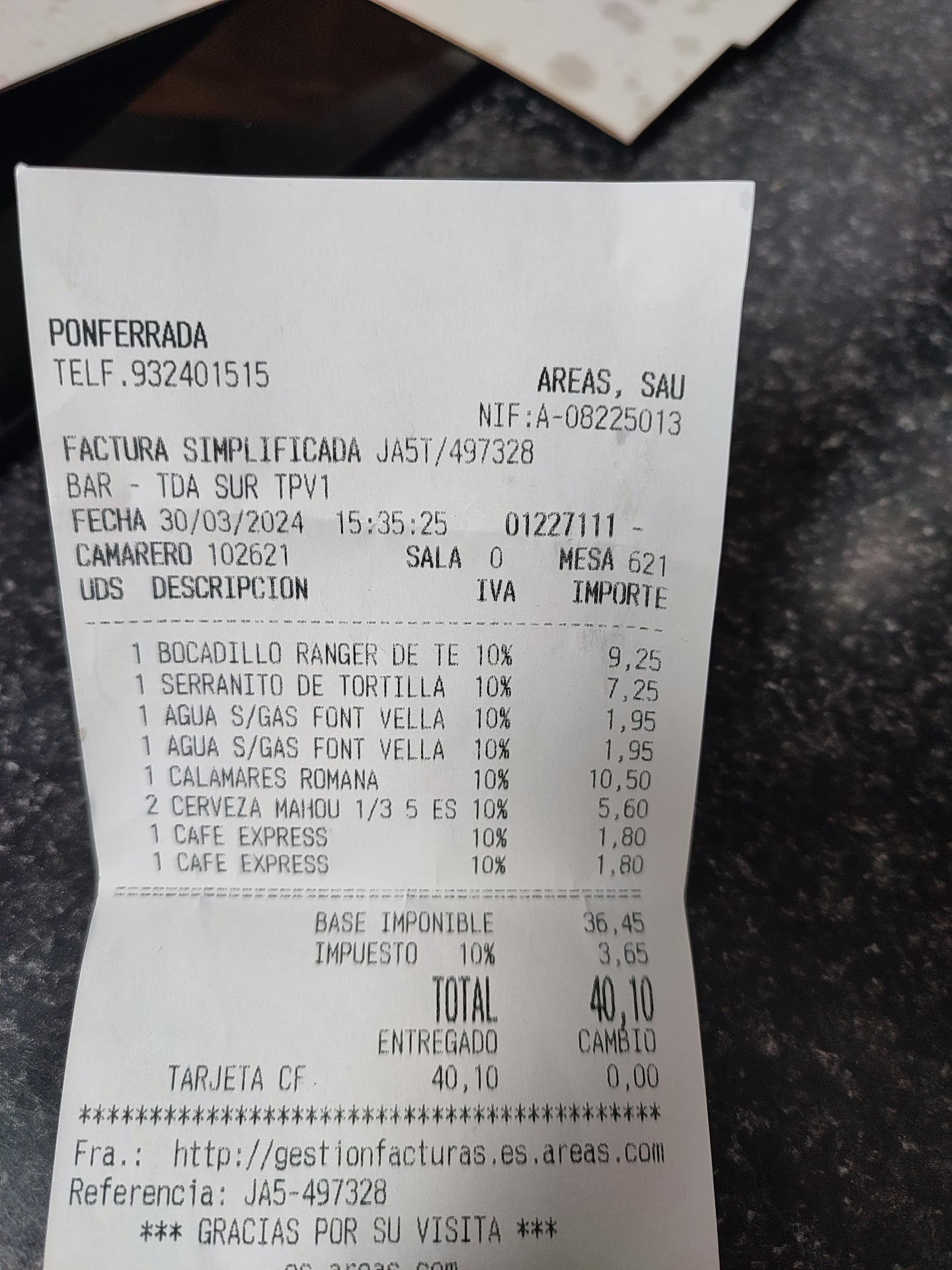 Read moreHemos hecho una parada rápida, hemos comprado para comer un sándwich de cachopo, más o menos bien, un bocata redondo de tortilla con jamón, seca la tortilla pero más o menos bien, y unos calamares, que exactamente eran cinco, los cuales tampoco eran una delicatessen por los que nos han cobrado 10,50, vamos una vergüenza. En total 40 euros, con dos aguas pequeñas, dos cervezas y dos cafés. Para que nadie piense en engaño, subo foto de la cuenta y de los 5 calamares. Si alguien tiene que parar en carretera, aconsejo no...