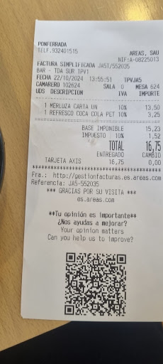 Read moreNo pongo menos estrellas porque no se puede. Me acaban de robar en toda mi cara y encima me dice después de insistir mas de una vez en que es lo que hay. Os pongo en situación: Cojo una ensalada, un plato de merluza con arroz blanco y una Cocacola … 25€, le digo que me parece excesivo y dejo la ensalada, me cobra por el resto 16,75€, Insisto en que me parece increíble debido a que la calidad de comida no es especialmente de lujo como para cobrar eso (parece catenring de hospital) y me contesta la chica que ella no pone los precios. De acuerdo, estoy trabajando y no me puedo permitir buscar más sitios para comer a esta hora. Pago, me lo como y salgo para irme. Veo un cartel que pone menú del día ¡transportista esto te interesa! …( yo soy transportista, no voy con traje ni nada que te haga pensar que no lo soy, por lo que me podías haber preguntado siendo un área de servicio pero bueno) paso y le pregunto y me comenta que claro el menú de transportista cuesta 15€ con primero, segundo y bebida. Genial! Me han robado en mi cara, me han cobrado por un solo plato, más precio del que era el menú, ya que según la empleada la ensalada no entraba como primero por eso los 25€ del principio 🙄… Total que encima la culpa es mía por no preguntar o no se pero solución ninguna, Lo suyo es que si una empresa ofrece ofertas de algún tipo y encima te reiteran el alto precio de producto ofrezcas o informes de las diferentes formas de comer en tu local. No lo recomiendo a nadie de hecho espero que ningún pobre transportista como yo tenga la mala suerte...