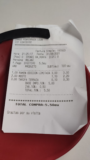 Read moreLlegamos preguntamos que había de comer. Nos dijeron 3 pichos, los pedimos, una empanadilla, una tosta de jamón pero del tamaño de una rodaja de pan de baguette, y dos cachitos pequeños de costilla. Barato Pero después de preguntar por los alrededores nos dijeron que era el único donde podríamos comer algo. Volvimos pensando en pedir los tres pinchos repetidos. Oh sorpresa que cuando preguntamos nos dijeron que solo había costilla. Pero se nos ocurrió decir que si no tenían bocadillos y apareció una carta con sandwiches, hamburguesas,... Pedimos dos sandwiches de la casa. Tardaron más de 40 minutos en servirlos. Total 11 y...