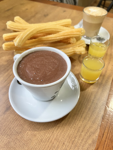 Un bar de barrio agradable, los fines de semana tienen churros y te ponen un chupito de zumo gratis y también se pueden encargar churros. El chocolate no era muy oscuro, pero estaba bueno, y los churros aunque no son los mejores, están buenos también. Merece la pena porque no hay tanta gente como en otras churrerías...