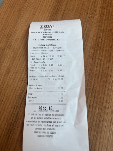 Como ha perdido Telepizza en el rosal Ponferrada. Una pena. La verdad que la media d las reseñas y las opiniones d los consumidores no engañan. Acudimos la tarde de el domingo 21/09 a las 19;30h. Solo tienen una persona, una chica que despacha y tb hace las pizzas. Me resulta escaso pero luego entiendo el porqué, estuvo prácticamente vacío y sin pedidos todo el rato q estuvimos allí. Dejo fotos. Mi hermano ya me dijo: que no te sienta mal; pero esa pizza tiene una pinta terrible 😂 (decido inmortalizarla) para cuando la que me la hizo la vea, se recree en su gran obra. En fin para no repetir. No pasa nada, xq será por opciones y ya de ir al Telepi, pues vamos al de Bembibre. Qué os da más vueltas que un pollo al as. Pd: cuidado con la publicidad con poca info y que provoca confusión. Omiten información y parece más promoción que la que es realmente. Iba a poner hoja d reclamaciones en local , pero al final este me parece un medio más inteligente para que llegue a más gente y evito dar datos...