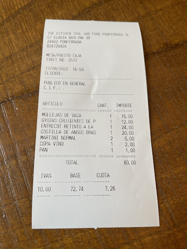 Read moreRestaurante moderno con propuesta del mismo estilo. La calidad del producto es buena y la ración correcta, la ejecución no tanto, fueron muy amables y aunque llegamos tarde nos atendieron estupendamente, pero se notaba la falta de profesionalidad, iban siempre a remolque y no sabían que había pedido cada comensal. La comida, mollejas bien, acompañamiento con parmentier mal, las Gyozas no nos gustaron, sabían demasiado a jengibre, las carnes bien pero el entrecot de ternera Retinta a 100€ el kilo (eso ni en el Capricho) además la salsa sweet chilly, la ponen en casi todo. El precio altísimo, por ese precio espero más cosas a parte de alimentos de calidad, como no tener que usar mantel y servilletas de papel, que los camareros tengan claro el orden y distribución de los platos y que sepan que les falta en la carta….. Os dejo la cuenta para que la veáis, no tomamos ni postre ni cogimos botella de vino, si lo hubiéramos hecho seguro que la cuenta se iría a más de 60€ per capita, un precio disparatado para lo que ofrecen, en Ponferrada tienes sitios con materias primas calidad similar y puedes comer por 20-25€ a la carta. Quizás sólo deberían tener menú, mucho más asequible 20€, o dar una vuelta a la oferta. Por cierto en madrid, ciudad mucho más cara, por ese precio comes en un...