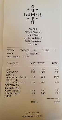 Read moreGumer has been a very nice ending to our trip in Galicia. The service is very friendly and since we don't speak Spanish, we appreciated the staff's willingness to talk in English. The food was great, we had the Tartar de atun rojo (very fresh tuna, I enjoyed the sauce but might be a bit too much for those who like their tartare simple), taco de langostinos (the best tacos we've had since we moved back to Europe) and Ensaladilla de atun rojo escabechado y huevo frito (flavorsome dish with nice acidity). They have a nice selection of wine, they also offer them by the glass although it is not stated on the menu. For the dessert we went with the tiramisu, it was lighter than a regular tiramisu which we appreciated since we were already quite full. The price to quality ratio is amazing given the quality of the ingredients that they use. I'd recommend a reservation since it was a full house by the time we...