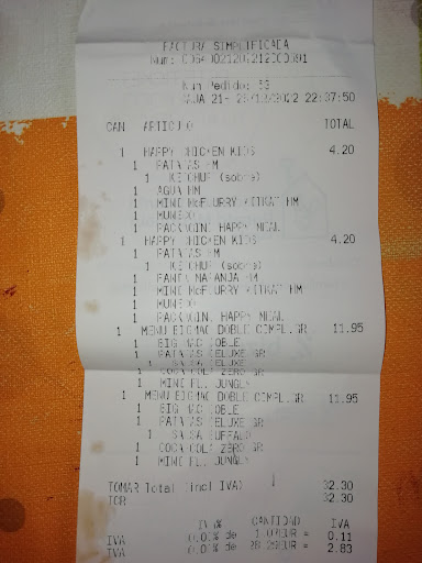 VISITA NEFASTA. 26/12/2022 Pues no hay mejor manera de relatar la que será nuestra última visita a éste centro. Lo primero, hacemos el pedido y la máquina no tiene papel para tener nuestro ticket de pedido y compra. Nos acercamos a que nos den solución y poco menos que les da igual. Despues de esperar y recriminarle su pasotismo, con malas formas nos dan por fin nuestro papel para poder hacer la recogida, que como se ve, también deben estar sin tinta. Después de mucha espera y ver como muchisimos clientes vienen al mostrador a quejarse tanto de la tardanza como de pedidos equivocados y que le faltan cosas, pues nos dan el tardío pedido. Como se ve en el pedido, con el happy meal de los niños, seleccionamos la opción de muñeco, y sin ni siquiera comentarnos nada, nos dan 2 paquetes que contienen dibujos dentro, los cuales no hemos pedido. de nuevo pues toca ir al mostrador a comentarles la equivocación y lo único que dicen es que hace mucho que no dan muñecos. Se queda con los dibujos de malas formas y nos da un libro y un coche para montar. le digo que me de 2 coches ya que no voy a dejar a un niño sin su juguete, y que no.. que no le quedan mas. a parte de todo ésto, el local estaba super guarro. las mesas a tope de pedidos sin recoger que ya estaban cuando llegamos y seguían cuando nos fuimos, y viendo las pepeleras pues no me extraña por que echaban por fuera ya. La responsable discutiendo en cocina con trabajadores y fuera con los repartidores de globo que también esperaban lo suyo por los pedidos, dando una imagen pésima. desde luego no volveremos y no...