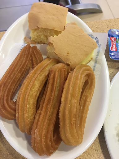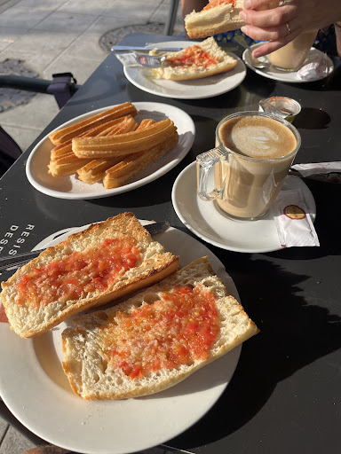 Stopped for a quick breakfast as we were biking past. Has a table outside so we could watch our bikes. We went in to order as it seemed the faster option. Our order came promptly and we were surprised by the complimentary churros. My wife thought they didn’t understand our very bad Spanish and got the order wrong. The provided oil and tomatoes purée in bought servings. It was a little light on the tomato. The coffee was at the average Spanish level, which unfortunately I am getting used to. No flat whites here. Overall, very good...
