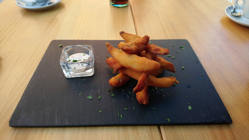 Read moreEl lugar es bonito y por dentro está impecable. La comida deja mucho que desear, los fingers de pollo no sabían a nada y traían una salsa en un botecito con 1cm de salsa, insuficiente no, lo siguiente. La milanesa era grande pero "nada del otro mundo", las patatas con gusto a aceite recalentado. Los postres.... La ración de tarta es más pequeña que una ración de postre de un menú de 10€ en Barcelona (y eso es mucho decir) y el precio es como un postre en Barcelona (que también es mucho decir). Pregunté si había posibilidad de que la porción fuera más grande y, básicamente, me dijeron que regatear un postre estando de vacaciones no era buena idea, que estando de vacaciones se gasta pasta (500€ en chuletones fue el ejemplo textual del camarero o encargado, no sé qué era). Le comenté que no era un tema de regateo, que estaba en Galicia y venía de ponerme las botas en lugares espectaculares a precios razonables, que vivía en Barcelona y sabía de precios altos y raciones pequeñas. Finalmente pedimos postre (estaba "antojada") y tanto el tiramisú como la tarta de queso eran deliciosos, cabe destacar el gesto del camarero/encargado que nos trajo una lámina de tarta de manzana "de regalo", muy rica también. Volvería? No! Que me traten de rata no me parece de buen gusto, sobre todo porque soy de salir mucho a comer y no tengo problema en gastar dinero en ello, que la comida salada no sepa a nada tampoco me atrae mucho que digamos. Es un lugar para tomar unas cañas o copas y nada más, desde mi punto de vista por supuesto. Supongo que esta reseña la estaban esperando, porque estaba claro que no iba a dejar de comentar el trato recibido. Teniendo en cuenta que trabajé 9 años en hostelería y se perfectamente cómo tratar a un cliente, el trato recibido (camuflado de humor) no...