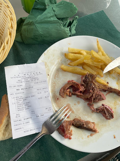 Los platos son de batalla para turistas que no van a volver, peor que un comedor de colegio pero a 18€ el menú. La ensaladilla rusa es una especie de puré, lo macarrones con chorizo, simple pasta hervida a la que luego le añaden directamente tomate frito de bote. El cachopo requemado y asustado con un poco de queso. Los espárragos con mayonesa pues eso, mayonesa de bote directa al plato, sin más. Los postres ni los pedimos por la situación que detallo a continuación….Lo peor y lo que casi ME COSTÓ LA VIDA (literalmente)fueron los entrecots que pedimos mi hija y yo, incomibles, llenos de fibras, no se podían ni cortar con el cuchillo y menos masticarlos, de tal forma que a pesar de buscar en cada corte el poco magro que tenía la carne (adjunto foto del entrecot), al final un trozo se me quedó atascado en la garganta, tanto el camarero como la camarera de la terraza (luego me dijeron que era la dueña, no sé si será cierto), vieron como me ahogaba y ni siquiera se acercaron a mi mesa, mi hija intentó hacerme la maniobra de Heimlich sin éxito y cuando estaba empezando a desesperarme un comensal de otra mesa con conocimientos de primeros auxilios (Sr. Enrique de Valladolid) me salvó la vida haciendo correctamente la maniobra Heimlich. Estuve unos 10 minutos recuperándome y NADIE del personal se acercó para ver cómo me encontraba, una vez recuperado entré y pedí la cuenta (ni postres ni cafés, sólo queríamos marcharnos), me cobró la camarera de la terraza (teóricamente la dueña) y de nuevo, ni se dignó a preguntarme cómo me encontraba, pagué con mi tarjeta y les expresé mi descontento con la comida y sobre todo por la poca humanidad que mostraron. Salí a la calle para volver a dar las gracias a mi salvador y pedirle los datos de contacto, mientras parece ser que alguien del restaurante habló con mi hija y le dijo que no me habían cobrado la comida, sea como sea eso es lo de menos, casi pierdo la vida por por una pieza de carne que nadie con un mínimo de vergüenza se dignaría a servir en una mesa. Está claro que nunca volveré a ese local y advertiré a todas las personas que pueda para evitarles una...