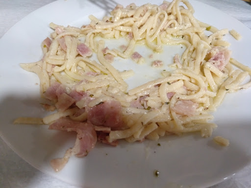Read more!!!! NO OS DEJÉIS SEDUCIR POR SU CARTEL!!! Los 13 euros peor invertidos de todo el viaje que hicimos por esa zona.. Menú muy variado y tentador .. Hasta que entras en el comedor (también llamado lata para sardinas) muy pequeño (pero idóneo por si quieres conocer gente comiendo, más que nada porque casi comemos todos juntos, no corría el aire entre nosotros en ese comedor) te dejan 1 hora esperando.. Entras, te toman nota, ves como van dando de comer a otra gente, (en este caso solo daban de comer a una mesa de 8 personas) y tú sigues esperando 45 min. De reloj por tu plato... Después de quejarte te dicen que están saturados 😕 pero eso no te quita de esperar otros 30 min. Más.. Te llega el primer plato, en mi caso, tallarines a la carbonara.. (NO LO PIDÁIS) TALLARINES RECIÉN SACADOS DEL MISMO INFIERNO... CAPAZ DE TRASPASAR TU LENGUA AL METERLO EN LA BOCA, RECALENTADOS CON 1 LITRO DE NATA LÍQUIDA POR ENCIMA... yo lo llamaría nata con tallarines jajajajaja después te toca hacer la digestión, porque obviamente te toca esperar otros 40-45 min. Approx. Menos mal que te traen el pan, ya tienes algo que comer mientras jajajajaja segundo plato.. HAMBURGUESA CON PATATAS (Pues bien, resulta ser 2 trozos de carne a la plancha requemada, con pimientos rojos de tarro fríos y patatas fritas congeladas malisimas) de este plato no pude comer nada... LO ÚNICO "COMESTIBLE" EL POSTRE , TARTA DE LA ABUELA... Este día tuvo quejas de todo el mundo que estaba allí, el famoso cachopo no debía estar muy bueno ya que la gente hacía una matanza al filete,llegaban enteros y el camarero se les llevaba descuartizado jajajaja en vez de ser de ternera ERA CACHOPO DE CERDO , jajajajaja (( LITERAL )) nuestro fallo fue no leer estos comentarios antes de entrar... En fin! Espero que os sirva de algo y disfrutéis del pueblo que es maravilloso y de su gastronomía que no creo que sea tan mala como la de este sitio. OTRA COSA QUE RESALTAR UNA CAMARERA DE UNOS 20 Y TANTOS QUE TRABAJA ALLÍ, Era super amable, trabajadora a la par que atenta con los clientes ... Me dio la pena, el mal trago que tenía que pasar al hacer frente de una coordinación nefasta y falta de higiene de ese restaurante..sin tener culpa, tenia que dar la...