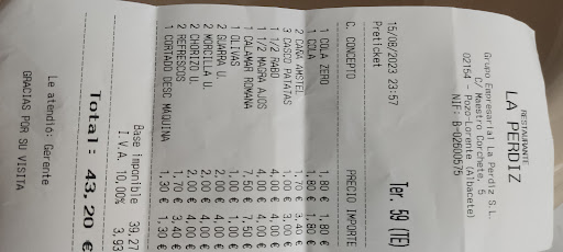 Read moreLa cena en la terraza del bar la Perdiz, en el parque municipal de Pozo Lorente, ha sido una sorpresa positiva. A pesar de haber muchas mesas para atender, pronto nos han puesto la bebida y la comida no se ha hecho esperar. La carta está llena de especialidades de la tierra, hemos probado las patatas asadas, carne con ajos, calamares caseros, rabo y una ensalada manchega. Todo muy bueno. La atención de los camareros magnífica y los precios muy ajustados. Además había música en directo, una chica que cantaba canciones flamencas con muy buena voz. No cobran con tarjeta, hay que llevar dinero en metálico. Totalmente...