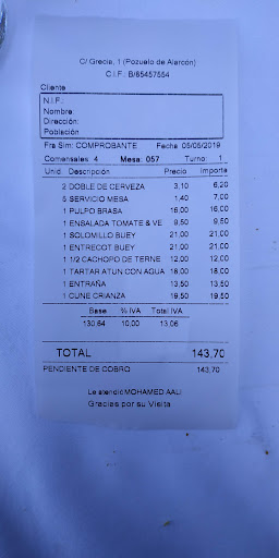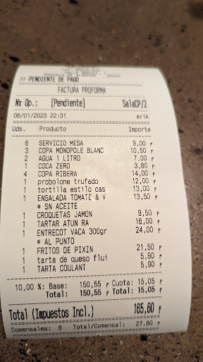 Al traernos la carta de vinos, pedimos uno y nos dicen que no hay, pedimos otro y tampoco. Finalmente nos dicen que solo tienen Cuné. Nos lo traen abierto y empapado y no estaba en carta. 20€ ha costado que no hemos sabido hasta el final. Además, tengo serías dudas de que esa botella abierta fuese un crianza Cuné.