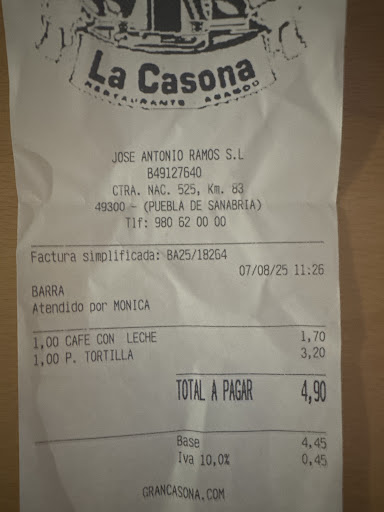 Read moreEl pulpo estaba duro menos mal que era una ración escasa eso si pagué 21,5€ La ensaladilla rusa “casera” no tenía mayonesa, un desastre, 9,50€ El desayuno el café con leche paupérrimo estaba aguado y la tortilla de patata era de supermercado, adjunto ticket Increíble que tengas que prepararte la mesa menos mal que no me la hacen limpiar No lo recomiendo a nadie, por eso puntúo el servicio un 1 porque solo están para cobrarte con antelación la comida que pides Bueno, por la respuesta que me das ya se ve como atendéis a los clientes porque yo admitiría una queja cosa que tú no lo has hecho si te puedo decir que el pulpo más la ensaladilla rusa + 2 Kebabs lo pedí con mi mujer y con mi hijo el día anterior anoche para cenar de acuerdo y las críticas hay que saber admitirlas y si no me levanté para pedir la mayonesa era porque estaba la barra llena de gente y esperar una cola de 10 minutos o 15 para pedirla, pues me fastidié y dejé la ensaladilla rusa, que por cierto dudo de que sea casera y respecto a la tortilla de patata no haces ningún comentario por lo tanto, me confirmas que la compráis en probablemente en un supermercado y la vendéis como casera, por cierto, le pregunté a tu compañera que estaba en la barra y le dije la tortilla de patatas casera, cosa que me dijo que sí Gracias y un saludo tranquila que no pienso volver...
