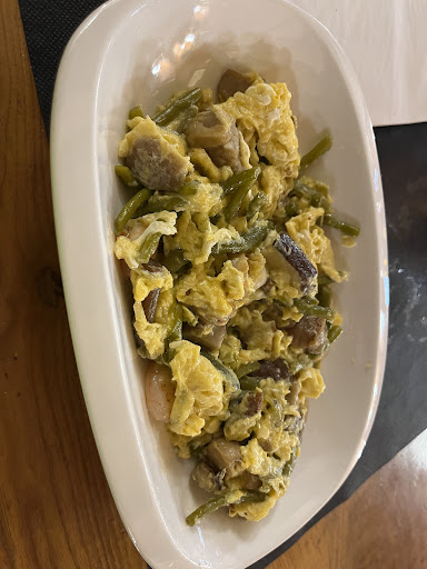 Comenzamos nuestra comida con el revuelto de gambas y espárragos, y déjame decirte que fue una explosión de sabores. La combinación de gambas frescas y tiernos espárragos salteados, todo unido por unos huevos perfectamente batidos, crea un plato que es tanto ligero como satisfactorio. Cada bocado era un deleite, con la suavidad del huevo complementando la textura crujiente de los espárragos.