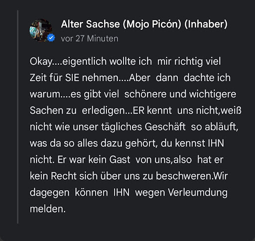 Wir wahren im März 23 im Alter Sachse. Wir haben Essen bestellt sowie eine Coca Cola und eine Cola light. Wir bekamen aber 2 Cola light. Nachdem ich die Chefin darauf aufmerksam gemacht habe Antwortete Sie , dann haben Sie Pech gehabt, aber in einem ton. Wir haben normal keine Cola, nur Privat. Darauf ist Sie in den Supermarkt nebenan gegangen und hat ein paar Dosen Coca Cola geholt. Am neben Tisch wollten Leute bestellen, Er wollte ein Cola haben, darauf die Chefin Cola Cola Pepsi Cola Light oder was Anderes. In meinen Augen Provozierend. Da ich nur Coca Cola trinke und sonst nichts. Ist das eine Frechheit wie mit Gästen da umgegangen wird. Am liebsten wäre ich nach dem Vorfall sofort aufgestanden und gegangen. Auf die Frage die gekommen wäre sie haben noch nicht bezahlt, hätte ich gesagt, da haben Sie Pech gehabt. Aber meiner Frau war es Peinlich. Wir werden den Laden Nie wieder betreten. Auf unsere Bewertung hat die Chefin geantwortet Ich habe die Antwort von Ihnen gelesen Antwort vom Inhaber vor 8 Monaten Wow, sie haben aber viel Zeit und Mühe in ihre Beschwerde investiert. Ich hatte den bescheidenen Arbeitstag bzw. die " nette "Begegnung mit Ihnen schon lange abgehakt, den ganz so wie sie es schildern war es nicht. Egal, der Gast hat immer Recht und der Dienstleister das Nachsehen. Ihre Entscheidung unseren Laden, welcher eine kleine Kneipe mit guter Hausmannskost mit gleichbleibender Qualität ist, nicht mehr zu besuchen können wir nur begrüßen...wir hätten sonst von unserem Hausrecht Gebrauch gemacht. Auch wenn die Chefin die Sache einfach Lächerlich machen, es war genau so wie ich es geschildert hatte. Dank meiner Frau hatten wir das Essen noch gegessen, Gegen das Essen haben wir nie etwas negatives gesagt. Aber so, nein Danke. So wie ich es inzwischen gelesen habe ist die Chefin launisch, so wie wir es auch erlebt hatten, mehr wie unfreundlich. Sie duldet keine ...