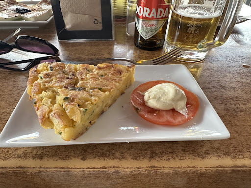 What a lovely find. A busy little cafe/restaurant with a good menu range from pizzas, burgers, sandwiches and tapas and more. It had a lovely friendly local feel about it even with the big wall mounted menu boards in 5 languages. They have seating inside and out under canopies on the edge of the square opposite the church. Unfortunately for us it rained very heavy and we did get a bit wet as edges of the canopies dripped and splashed. The staff were attentive, but did not rush you and the kitchen/bar area looked very clean, as were the toilets. We had the Tenerife pizza and it was delicious, unusual with banana on it, and thin crispy crust just how we like it. The coffee very good taste. Pizza (big enough to share), 2 beers and 2 coffees came to less than 15 euro. Good...