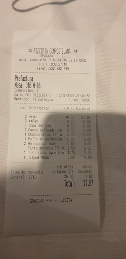 Read moreThis is the first time we have visited Puerto de la Cruz and we found this restaurant on our first night. My partner had the steak and I had a pasta and sauce. The food was delicious, cooked to perfection with lots of flavour and the service was lovely. We have since searched the town for other restaurants in the evening and tried several different places and the service wasn't as great and food was mediocre compared to Compostelana Avenida. We have noticed there are other Compostelana restaurants past the harbour (to your left if you are facing the sea) and we are extremely interested in visiting those before we go home. We don't have children but there were a few families around us with kids and the waiters were more than helpful to accomodate their needs and were fun with the children. There's not a lot of restaurants around Puerto de la Cruz were you will enjoy your meal and have excellent service all in one. We have eaten here three times in 6 days and we have tried the pizzas, pastas and the specialities between us. Very...