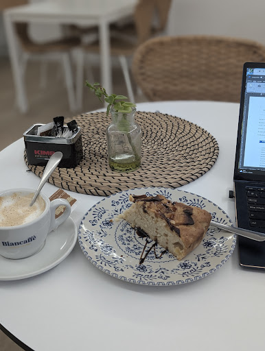 Fui a tomar un desayuno de media mañana, estuve 47 minutos con un consumo de un café con leche tamaño normal, una tarta del día y luego otro café con leche grande. Mientras consumía abrí el computador para aprovechar de revisar unos correos a pesar del ruido constante de un taladro que al parecer provenía de una obra en el piso superior y cuando ya voy en la mitad del café grande, unos 45 minutos desde el ingreso, me señalan que se olvidaron de mencionar que hay un fee de cowork de 6 eur cada 3 horas si uno se instala con ordenador por uso del wifi, espacio, etc. Me parece bien si son las reglas del juego, le pregunto a la camarera si en este caso me lo aplicarían también ahora de forma retroactiva y me dijo que si, le pedí que por favor pregunte que al no saberlo ofreciendo retirarme en el momento también me lo aplicarían y que si le decían que se lo cargarían a ella, yo no tendría problemas en pagarlo (ya que en la comunicación la vi algo complicada entendiendo que el asunto había sido conversado con quién le dió la instrucción... A pesar de todo, ella amablemente fue a preguntar y tras varios minutos regresó señalando que le dijeron que si me iba a continuación no se aplicaría. Por supuesto que a su regreso ya había guardado todo, la rápida un último sorbo de café, la cuenta y adiós.