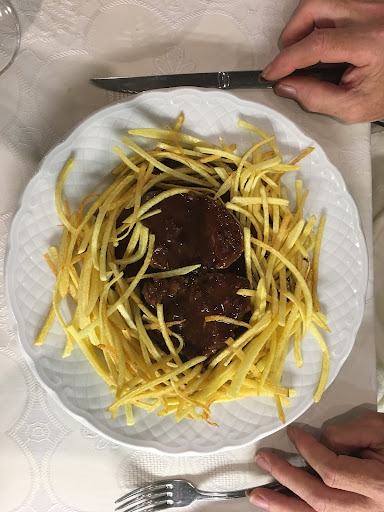 Nach Vorspeisen (katalanische Gemüsesuppe und an Bruschetta erinnerndes, geröstetes Brot mit Tomaten-Knoblauch-Paste und Olivenöl bestrichen), Hauptspeisen, die allesamt in Richtung Filetsteak bzw. Ragout gingen, waren die servierten Nachspeisen abschließendes Highlight. Flammbierte Erdbeeren, Zitronensorbet und Crema Catalina - die durch das Karamellisieren der Zuckerschicht oberhalb im Übrigen sein typisches, herbes Röstaroma erhält, was nicht jedermanns Geschmack ist, wie eine andere Bewertung zeigt. Doch gehört eine leicht herbe Note der Zuckers meines Wissens nach zu dieser Nachspeisen, um mit der Süße der Crema selbst ein Gesamtaroma zu bilden, was meiner Meinung nach definitiv gelungen ist! Bei diversen Restaurant besuchen, auch in Katalonien selbst, hatte ich wiederholt diese Nachspeise und die Machart ist immer dieselbe, somit ist es sicher eher Geschmacksfrage, als verbrannter Koch-Fail 😉). Die Filetsteaks wurden Medium bestellt und waren auf den Punkt zubereitet, top! In allen Varianten geschmackvoll abgestimmt, wurden die Teller unter genussvollem Lächeln leergeputzt. Lediglich meine Pfeffersoße hätte einige Körne in Schärfe und Anzahl mehr vertragen 😀, aber das ist Jammern auf hohem Niveau. Der gereichte Weißwein vom einheimischen Weingut Monje aus der Nähe von Sauzal war ein absoluter Leckerschmecker, darf somit als Getränketipp verstanden werden, wenn man Teneriffas Weine kennenlernen möchte ☝️