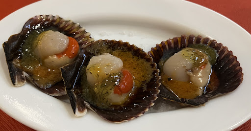 Every dish is shared between 2. Ordered 3 scallops, &3 large prawns (€2.75 unit price) to start. Then had the local “Pescado de la Isla” (local fish which I identified in my fish book as Alfonsino i.e., red seabream). Absolutely fresh & lovely wt looooads of soften garlic cloves & coarse salt 🤤😋. Had the medium rare entrecote & sopresa (surprise) potato which were like triple cooked chips wt garlic & parsley…so good!