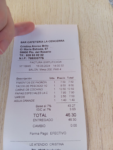 Read moreLa Cencerra, en Puerto del Rosario, destaca como un auténtico rincón de cocina tradicional canaria. Sus papas arrugadas son insuperables, y el menú del día ofrece platos llenos de sabor, como la ensaladilla rusa. El personal es excepcionalmente amable y bien informado, especialmente en temas de gluten, lo que garantiza una experiencia inclusiva. Además, el ambiente local y acogedor permite escapar del turismo masivo.El precio por persona aprox: 20€.