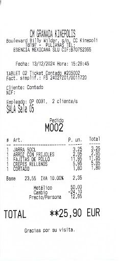 Read more¡Magnífico lugar! Esencia Mexicana en Granada Kinépolis es una auténtica joya de la gastronomía mexicana. Desde el primer momento, la atención al cliente fue impecable, y el menú ofreció una variedad deliciosa y auténtica que no dejó espacio para quejas.