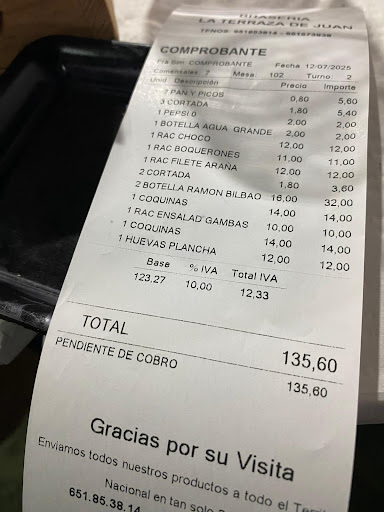 Read moreMuy mala experiencia pedimos carne que supuestamente era presa y nos llevaron una carne dura y quemada y ojo con esto nos dieron la carta donde dice el precio de 100 gramos que por lo que pedimos que era pescado era de 6 euros los 100 gramos al momento de servir la comida nos llevaron cómo 350 gramos y al momento de cobrarlo lo hicieron como 650 gramos cada plato salió en 32.50 euros según la cuenta del restaurante nos sentimos asaltados sin armas es una total estafa realmente cuando ven que eres extranjero se aprovechan es una lástima porque no quedas con ganas de regresar a ese sitio y así otro restaurante que se encuentra enfrente de la playa muy...