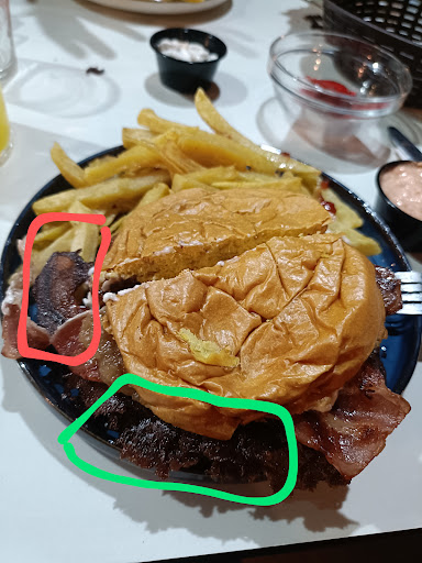 He venido varias veces a este lugar en el cual salí contento, algo caro pero realmente la comida no era mala aunque el servicio da algo que desear. Hoy dia 31 de Agosto fue la peor cena de mi vida con mi pareja. Volvimos al sitio que nos gustaba pero con una muy mala experiencia. Pedimos dos hamburguesas. La mia estaba algo requemada pero la de mi pareja parecia carbón, se caia a cachos al tocarla, nos servia para hacer una barbacoa en los pinos con los amigos. Se lo comentamos a la camarera y nos dijo que son así, que si quiere la cambia pero que iba a llegar igual. Cuando llega la nueva, estaba totalmente cruda, parecia sacada del frigo, la cual mi pareja dijo que no la queria que se la llevaran, no queria caer enferma y en este caso el camarero le dije que esas eran las dos opciones que tenían (o carbonizada o totalmente cruda) que si no le gustaba las smash. El pan brioche siempre lo pasan por la plancha, hoy estaba arrugado y sin hacer. El bacón de mi hamburguesa la tuve que quitar, con ese bacón tan carbonizado podia cortar el plato si quería, las mesas de al lado se dieron cuenta. Al traernos la cuenta, vimos que cobraba la hamburguesa que devolvimos. Claramente pagamos, pero descontamos la hamburguesa devuelta. Un sitio donde no volver. En la foto veis de rojo el supuesto bacon y de verde el carbon por...