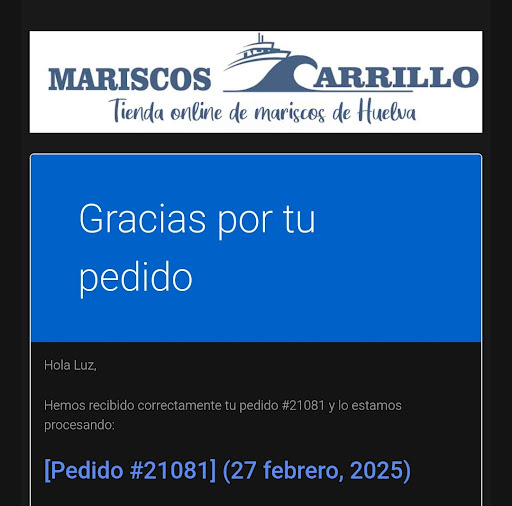 Read moreMás de 10 pedidos entre yo y mis familiares, cliente desde 2020, muchas buenas experiencias y una mala gestión hará que no vuelva a pedir ni a recomendar más a Mariscos Carrillo. Si un pedido de marisco llega caliente y al abrirlo huele algo fuerte, mal, si los cuerpos están para tirarlos, peor... El señor Javier me prometió un kilo de cuerpos en mi siguiente pedido para "solventar" el problema y se compromete a que esta vez el pedido llegará bien, pues bien, este segundo pedido (por el que pagué 40 euros) volvió a llegar caliente y me lo entregaron en un coche particular. Por supuesto lo rechacé e inmediatamente recibí una llamada del señor Javier casi forzándome a coger este pedido. Si hago un pedido nuevo de otros 40 euros (en parte para recibir la "compensación") y vuelve a entregarse el marisco en las mismas condiciones no tengo más remedio que rechazarlo para no seguir perdiendo dinero. El señor Juan, muy amable siempre, nos llamó para aclarar el tema y se agradece pero, lamentablemente, el problema no ha sido resuelto y no nos quedará otra que dejar de pedir marisco y dejar de recomendar Mariscos Carrillo. Por cierto Javier, no hace falta amenazar con que vas a dejar de enviarnos pedidos, ya hemos visto lo pendiente que has estado de enviar el último, has estado tan encima y tan pendiente que lo has enviado exactamente...
