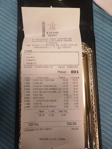Read moreExcelente chiringuito en la ría de Punta Umbría, con unas magníficas vistas, un ambiente muy agradable, con un trato muy amable y atentos por parte de los camareros y por su puesto la comida sobresaliente. El pescado muy fresco y sobre todo resaltar el ceviche de corvina es una delicatessen. Un lugar para repetir en todas las...