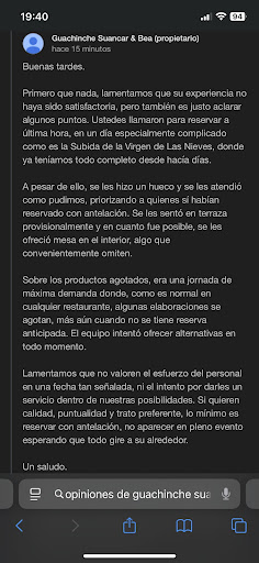 Read moreComida de amigos domingo 2 de febrero, pre indianos. CAOS total, una falta de organización en cocina terrorífica. Podemos entender, y así nos los comunicó el chico al sentarnos, que estaban super liados y el servicio se retrasaba un poco. Pero un cero patatero a la cocina, los platos a cuenta gota, 4 horas casi para acabar el almuerzo de plato a plato casi hasta 40'. Y seguían sentando a gente a las 5 de la tarde y las mesas aún sin la mitad de los platos. Critica constructiva: al chiquito jovencito quizás era mejor ponerlo a sacar platos o ayudar algo en la cocina, aún no tiene rodaje para estar afuera con una clientela algo cansada de esperar y su falta de experiencia le hizo cometer errores muy feos, arma de doble filo esa táctica quien tomó la decisión de poner a un chaval con esa presión. Abarcar lo que se puede manejar creo que sería más acertado, por grupos, por número de comensales a los que se puede atender correctamente.... Pero cada uno hace y decide lo que crea conveniente. Demasiado caro para lo que se comió, el calabacín pasadisimo de precio, no era un calabacín entre los dos platos que se pidieron por 17€. Josué el más preparado y consiente de todo lo que estaba ocurriendo y muy humilde y franco, fue uno de las razones por la que decidimos quedarnos. Ánimo!!!