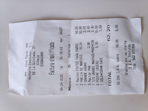 Read moreComimos bastante bien en Casa Pardo. Comedor agradable. Pedimos dos menús de fin de semana. De primeros unos puerros gratinados con queso y jamon dulce que resultaron muy buenos, sabrosos, bien hechos. Y unas alubias con tropezones (era casi un cocido en toda regla)...buenas de sabor, buena salsa, bien los tropezones. Sorprende el vino del menú, un Peña cabarga con algo de aroma pero cortisimo, sin cuerpo y que ellos mismos...te recomienda tomar con...gaseosa (pésimo sÃntoma). Desde luego, el vino no tiene el nivel de la comida. Tampoco el pan, tÃpico pan de barra industrial, sin peso, con poco sabor. De segundos pedimos un pescado que llaman breca (creemos que es pagel), bueno, mucho sabor, bien hecho y carne estofada con un toque de pasas logrado. Estaba muy bien también. De postres un arroz con leche frÃo de más y al que le faltaba algo de sabor, pero que estaba suficientemente bien...y una tarta de manzana que debió ser buena recién hecha (bien el hojaldre, equilibrada la crema y la manzana) pero que estaba bastante seca. Lástima. Y sus cafés también correctos. En resumen, comimos bien en Casa Pardo, exceptuando el...