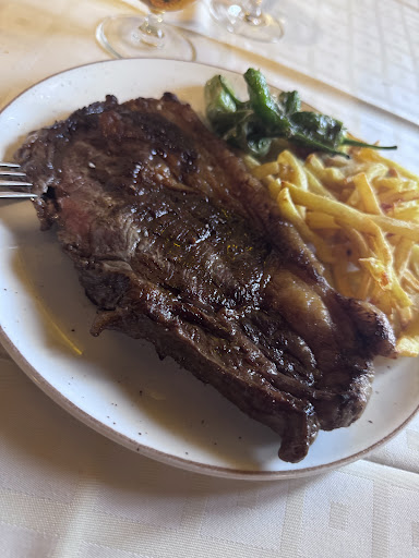 Read moreHemos comido cuatro adultos y dos niñas. Viernes Santo. Nos han atendido de lujo. El comedor a pesar de ser en la planta baja con la chimenea y la calefacción de pellets se estaba de lujo. Daba gusto estar. La atención de los camareros en la barra como en la mesa de lujo, a puro mimo. En la barra hemos pedido consumición para 4/6 que éramos y nos han sacado tapa para los seis. Muy atento. Las brochetas de pollo y gambon con salsa de soja impresionantes y el revuelto de morcilla además de por presentación, impecable el sabor. Mi marido se ha pedido el chuletón a la piedra y no sé la ha podido terminar. Raciones para compartir. Además habíamos pedido para mí y mis dos hijas dos entrecot para compartir y nos ha indicado la camarera que era muy grande y que tal vez con uno nos servía y que si luego queríamos más ya pediríamos. Hemos pedido solo uno y nos lo han sacado cortado en una piedra además de un plato de patatas y pimientos verdes. Vamos era tan grande la ración que no hemos podido terminar con ello y nos lo han preparado para llevar. Y para finalizar nos han invitado a los licores. Vamos una gozada. No se puede pedir...