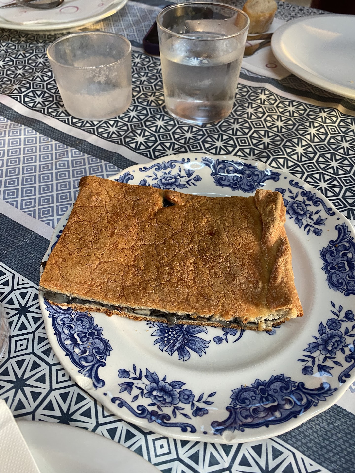 Comida sin más. Raxo con patatas fritas de bolsa de vermut (7€, 4 piezas), pimientos de padrón (6 euros, 300 gramos), media tortilla (4 euros), pan (1 euro), aguas (2 euros)