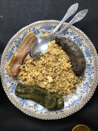 Comimos sopa castellana, un plato de migas y un plato de cochinillo asado. Y para terminar, un crepe con nutella.