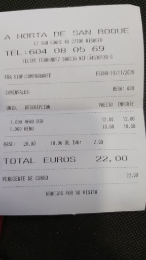 Read moreThe decor is good and the restaurant looks lovely on the inside. The starter of croquetas was a bit oily but the main of churrasco was tasty, if a bit too salty, with the sweetest grilled pepper I have eaten in a while. The dessert of flan de queso, I am sorry to say, was horrendous. The caramel was burnt and bitter and I could not stand eating it. For me, a restaurant is only as good as its dessert and I sorry to say that A Horta de San Roque disappointed me with a sub...