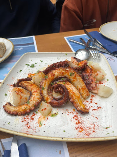 Antes de comer estuvimos tomando un aperitivo, nos pusieron unas tapas de la zona que estaban riquísimas y perfectas para ser una tapa. Las raciones y platos principales que comimos fueron: Pulpo a la gallega: estaba delicioso y se deshacía en la boca Pulpo a la feira: exquisito y en su punto perfecto para hacer a la brasa. Arroz negro con calamares: uno de los platos principales importantes que te traen a la mesa aún haciéndose, se avisa que le quedan 2 minutos y exactamente dos minutos después está perfecto para comer con un toque de arroz en su punto y los calamares hechos perfecto, no quedó nada en el plato. Filete de Croka: parte de la cadera de vaca en su punto acompañado de patatas y pimientos, el punto de la carne era perfecto y se deshacía e incluso se podía cortar sin necesidad del cuchillo, en muy pocos sitios he podido disfrutar de una carne tan grande y tan bien hecha como en este sitio. Los postres en general que se pidieron en la mesa estaban a gusto de todos y eran artesanales.