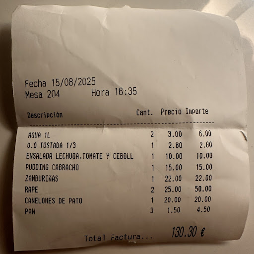 La comida, en general, nos gustó. Buen sabor, el rape estaba bueno, el pudin de cabracho correcto, y se nota que trabajan buen producto. Pero hubo detalles que decepcionan: la ensalada llegó sola y demasiado pronto, el rape venía con tan pocas patatas que parecía que se les habían acabado, y los canelones de pato llevaban tan poco que era difícil encontrarle el sabor. El servicio fue desorganizado, sin coordinación ni atención.