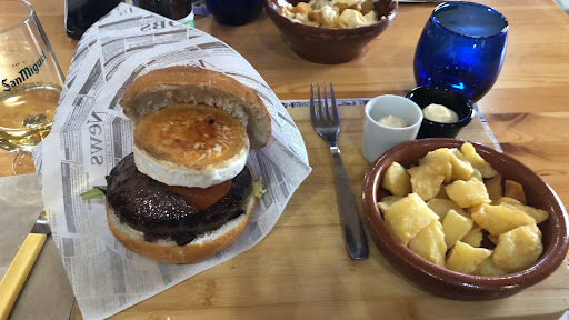 Read moreEspectacular es poco en todos los aspectos! Al principio no sabíamos si podíamos comer allí porque nos acababan de echar de un sitio ya que no éramos residentes… Muy hospitalarios nada más llegar. Me asombró la limpieza y lo cómodos que eran los baños, ojalá en todos los sitios fuera así. Pedimos de entrante algo que no habíamos probado nunca: croquetas cremosas de pistachos. Impresionantes! Pedimos hamburguesas y nos las sirvió el propio cocinero. Nos comentó de qué estaba echa la salsa que acompañaban las patatas (nos sorprendió para muy bien) riquísima!! A mi pareja le comentó si la hamburguesa no estaba en el punto que quería, se lo informase para cambiarlo. Un cariño y una amabilidad increíble. Muy muy agradecidos! De repente apareció el dueño, no creíamos que pudiera haber una persona tan amable y tan simpático. Pudimos conversar con él,se preocupó por nuestro bienestar para que pudiéramos estar cómodos y consiguió que nos fuéramos de allí con una gran sonrisa. Confirmamos que son las mejores hamburguesas que hemos tomado. Una lástima que no hubiera postres de la casa, pero aún así, un 10 para el brownie y el coulant de chocolate. Creemos que la propina que dejamos era demasiado baja… pero volveremos en cuanto...