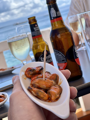 Read moreUn bar con encanto. Entras y es una pequeña tasca pero al fondo te encuentras con una mini terraza con 5 meses y unas vistas preciosas a la playa y el mar, que está justo debajo. En días soleados y no tanto puedes tomarte una cerveza bien fresquita acompañada de una tapa de mejillones que siempre dan al pedir bebida.Eso sí, no pidas más comida pues en este sitio solo se sirven bebidas y poco más. Genial para aperitivos o desayunos mirando a la bonita...