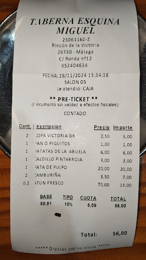 Ubicada en pleno centro de Rincón de la Victoria, habíamos hecho varios intentos de ir a esta taberna por la fama que tiene, pero había sido imposible ya que está siempre a reventar, y es que en su interior solo cuenta con una barra y cuatro mesas y en el exterior con las dos repisas de las ventanas, que sirven para apoyar los platos y vasos de los clientes que están en la calle. Por fin, encontramos una mesa libre a la hora de la cena, muy temprano y pudimos acomodarnos en el interior. La carta se compone de embutidos y raciones, entre las que predominan carnes y pescados, teniendo en la mayoría de los platos la opción de pedir media ración. Nos decidimos por media ración de corazones de alcachofa con jamón, media de patatas de la abuela, media de pluma ibérica, un flamenquín y un caldillo de pintarroja. Con una caña y dos refrescos, una cuenta de 37 € para tres personas. No nos ha convencido nada; el lugar es terriblemente agobiante; aun estando sentado, prácticamente estás rozando con los clientes que permanecen de pie, aunque no haya el más mínimo hueco y no se recatan en pegarse todo lo que pueden a los comensales que están sentados; en cuanto a la comida, nada del otro jueves, platos pequeños y muy corrientes; berenjenas de bote; las patatas de la abuela, que tanta fama tienen, son patatas fritas normales y corrientes con ocho o diez almejas; el flamenquín llegó crudo y tuvieron que recalentarlo, así que es de imaginar cómo llegó la segunda vez; la pluma y el caldillo si estaban buenos. En resumen, 37 € por muy poca cosa y para salir con hambre; ni le veo la gracia ni comprendo que esté siempre lleno. Por cierto, de la atención, nada que objetar, el camarero que nos trajo los platos, agobiadísimo y a la carrera para intentar satisfacer a...
