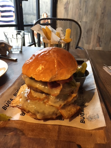 Después pedimos la hamburguesa doble 9/10 (14€ con patatas y salsa incluidas), que es "muy grande", y puedo decir sin lugar a dudas que es la mejor hamburguesa que he comido en Rivas, y he probado casi todas. Carne con muy buen sabor, muy buen pan, y bastante queso, en general una hamburguesa muy jugosa.