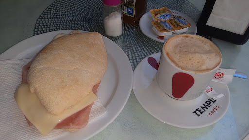 Hospitality at its greatest, non-tourist oriented the way that is authentic AND very kind and customer friendly. Nice window seat at premier shopping street combined with grat value. Recommended: Molette sandwich either jamón serrano or tomate and cheesecake, cortado coffee, Americano also great. The tomate is a spread that is served separately. It does help if you are willing to speak a few words of Spanish or use the (Google)...