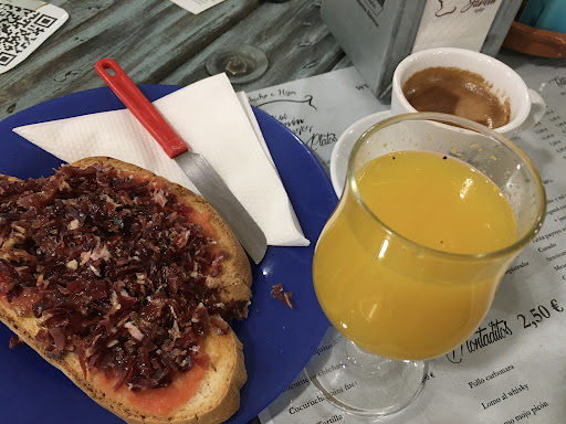 This is a great place to visit and savor. A very large space split with a large display of dozens of Jamons on the wall. You can choose your cut and get the freshly carved meat deli-style, or get delicious sandwiches. The deli also includes many other local products beautifully conserved and displayed. In addition to the deli there is a large display area of memorabilia and paraphanelia, including accessories, records, toys, kitchen appliances and much more, all beautifully curated and displayed. Last but not least, in the same space there is a small cafe with coffee, sandwiches, cakes and simple but delicious breakfasts. We came one evening to visit the shop and decided to come back the next week for breakfast, which was great. Don't miss the traditional local toast with crushed tomato and shredded...