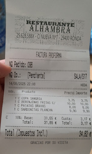 Read moreAfter a long day we wanted a good meal, with no messing about, and thankfully Alhambra delivered! A very friendly atmosphere, great service and nice looking dishes which tasted even better than they looked, we were very happy. Big sizzling prawns in delicious garlic and spiced olive oil, mopped up with fresh bread was a delight. The grilled sardines with tomato, pesto and mozzarella salad were a perfect combination. Plus cold beer and a sunny outside spot it was a great...