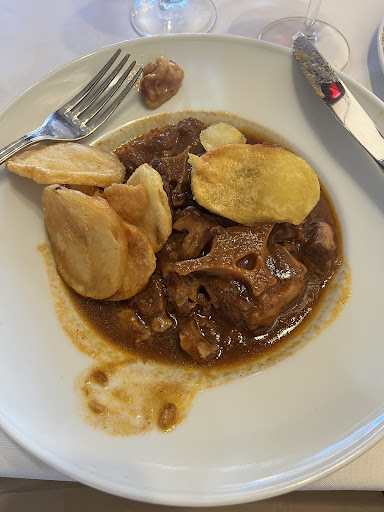 Plus points: the main course was delicious: oxtail sausage wrapped in mushroom pate wrapped in filo pastry, a red wine and almond sauce, sauté pots and pickled red cabbage. Amazing. Wine also very good, a local red. No complaints on quality.