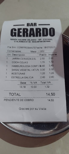 Read moreEn el bar Gerardo no saben lo que es racionar la comida, ya que todo es super grande y de sabor esquisto por lo menos la hamburguesa que me comí la completa doble con huevo y bacon, se nota que todo es casero, y ese toque de pimienta en la carne hace que quieras repetir, pero al día siguiente, ya que como dije al principio con una hamburguesa te quedas extasiado de lo grande que es, en cuanto al precio me sorprendió muchísimo ya que para ser tan grandes tienen un precio super bajo, rondando de 3 a 5 euros dependiendo de lo que elijas y se come mejor que en el burguer y MC Donald, la única pega que le encuentro es que no tienen patatas y una hamburguesa sin patatas es como Scooby sin Shagui, sientes como que le falta algo, por eso es que en vez de 5, le doy...