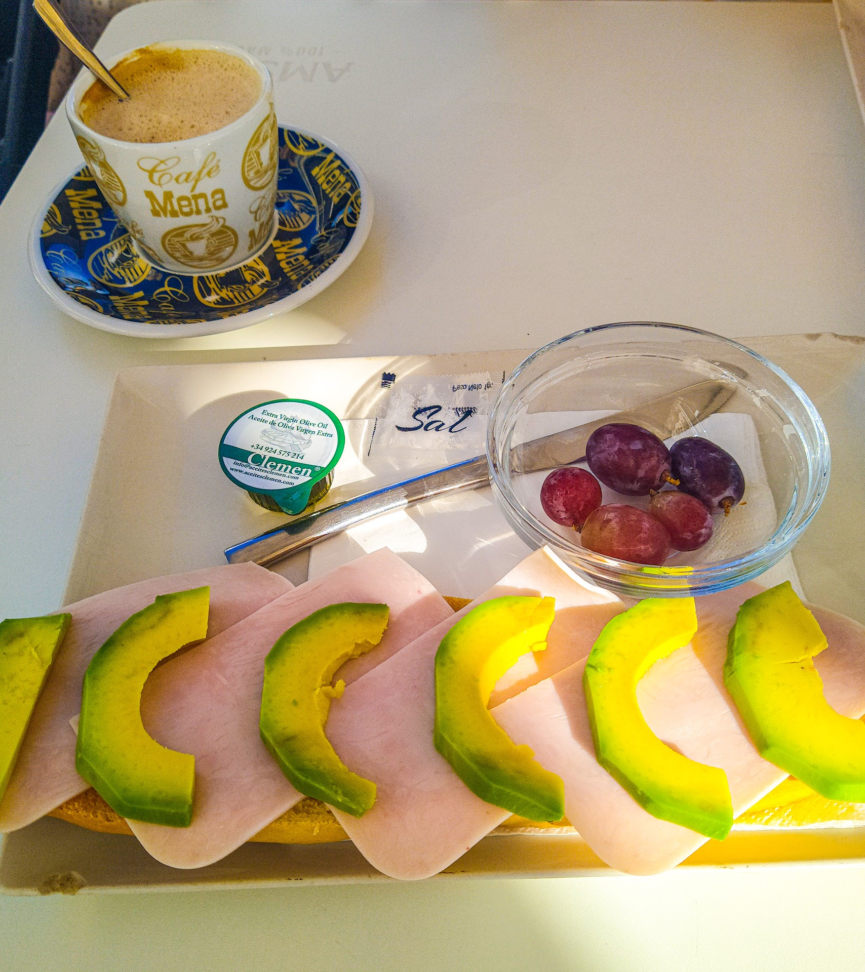 PRECIO: Día 1: Café con leche, dos rebanadas de pan de semillas con aceite de oliva y tomate = 3,20€. Día 2: Café con leche, dos rebanadas de pan de semillas con aceite de oliva, tomate y queso gratinado = 4,70€.
